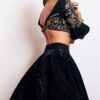 A dark green embroidered blouse with frills paired with a simple velvet lehenga is super elegant and trendy in its own. Pair it with a stylish bold earrings to glam it up!