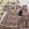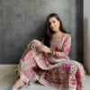 Add charm to your wardrobe with this stunningly designed Kalamkari sharara suit. This gorgeous suit crafted from light cotton fabric features intricate hand block printed kalamkari art and is accentuated by elegant floral embroidery work all over the body. Perfect for special ocassions and festivities, the zari work will add a touch of glamour to any look. It comes along with a classic sharara and designer dupatta of similar fashion.