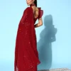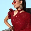 Ethnic Race exclusively brings this bollywood style gleaming red saree made from premium quality to you. Ace your look with elegance and glamour wearing this gorgeous saree. Made from luxe georgette fabric this saree is loaded with heavy and delicate sequins work that adds a touch of sparkle and grace. This saree comes with a banglory silk blouse piece. This beautiful saree is a perfect choice for any wedding or grand event.