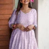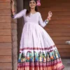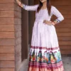Madhubani prints are popular Mithila art emerging from Bihar. This beautiful white bandhani Indian gown is loaded with divine Madhubani prints giving an insight into Indian culture and tradition and can be worn on auspicious occasions.
