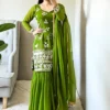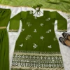 The highlighted embroidery work over the kurti elevates the overall look of the green sharara suit whereas the flowy sharara pants add a touch of style to it.