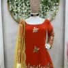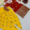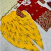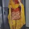 The traditional red and yellow blend Patiala suit in zari work is a must have in new brides’ wardrobe. The upper red kameez or top is crafted from georgette fabric with heavy sequence embroidery on it. Whereas the lower yellow patiala is also embedded with heavy sequence work. The outfit is suitable for all body types and ensures all day long breathability. The suit set also features a net dupatta with delusive zari work on the borders.