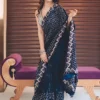 Let your inner style shine through this exquisite navy blue Sequence saree. Made from rich fabric, the saree features intricate sequence detailing with hexagonal patterns and embroidered borders on the edges. It will quickly become your favorite as its breathable for maximum comfort during long wear. Whether you’re attending an evening event or just lounging around in style, this eye-catching statement piece is sure to elevate your wardrobe for all occasions. It is paired with a contrasting sparkling blouse in silver shade.
