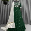 If you are a chikankari lover, then wait. We have got this exclusive Chikenkari Indian Evening Gown In Castlelon Green Shade only for you. This adorable dress is curated with heavy white floral embroidery on the chest. while the bodice is floated with white polka dots to give a clean look.