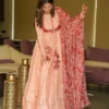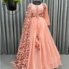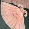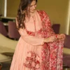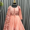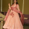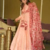 Get ready to charm the crowd in this exquisite Salmon peach ethnic gown. This full sleeved attire is tailored perfectly in satin silk fabric with an attractive neck yoke and subtle kalamkali work. The kalamkari dupatta with embroidery on its edges works as a game changer for this outfit by elevating the overall look.