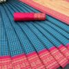 This saree is perfect for making a statement at any event. The peacock blue color is eye-catching and vibrant, and the checks pattern is unique and stylish. The saree is made of high-quality Kanchipuram silk, which is soft and luxurious. It’s easy to wear and drape, and it’s sure to turn heads wherever you go.