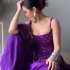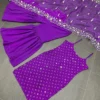 This designer sleeveless iris sharara suit is a must have in your ethnic wardrobe. The top is embellished with detailed mirror work which is paired with a plain sharara and designer net dupatta which is beautified with intricate embroidery work.