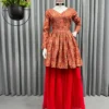 This paisley printed suit comes with a V- shaped neckline and full sleeves and is accompanied with a reddish orange plazzo which makes it a perfect casual wear.