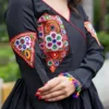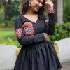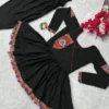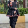 The dhoti salwar kurti set has been elegantly adorned in gamthi and real mirrorwork making it a perfect Indian attire that makes you stand out in Navratri 2023.