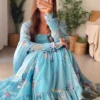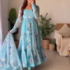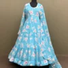 Long evening gowns are well-praised by Indian ladies for their beauty. This full-sleeved long Indian dress is crafted from georgette fabric and features stunning digital flower patterns accompanied by a matching dupatta.