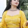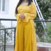 Indo-western style sharara set in mustard yellow color is made using georgette fabric and features digital print and embroidery work for a captivating look.