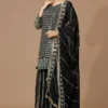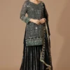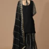 Be the talk of the town, wearing our partywear sharara suit in black georgette fabric. This amazing designer sharara dress is studded with heavy zari work for a look that is perfect for wedding receptions.