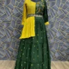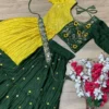 Green crop top lehenga set complete with belt and dupatta, will make you look stylish and unique at any mehendi function or grand occasion.