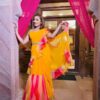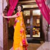 Shimmering yellow pink festive wear saree designed to make you look best in your next Indian function.