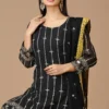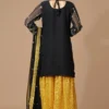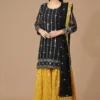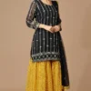 Look your best in this stylish Pakistani Gharara suit for women with intricate detailing. This black partywear gharara dress is tailored to perfection and finely detailed with zari embroidery and comes with a net dupatta of similar fashion.