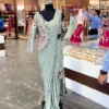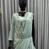 Be a fashion icon by adorning this beautiful georgette partywear saree in pistachio shade with floral embroidered border which is paired along with an intricately embroidered jacket.