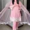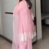 Look fashionable by donning this peach salwar suit set stunningly embellished with heavy embroidery work that exudes elegance and charm.