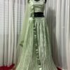 This is a beautiful and bold lehenga that is perfect for making a statement. The metalic pista color is eye-catching and unique, and the satin silk fabric is luxurious and smooth. This lehenga is sure to turn heads and make you feel like a princess.