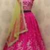 Be the unconventional bridesmaid in this Rani Pink Lehenga with a V-neckline that accentuates your style. The overall delicate embroidery adds charm to the whole outfit. A contrast embroidery on the dupatta is highly appealing to the eyes. Add to cart kind of outfit!
