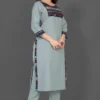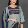 Grey kurta set for women in cotton blend is fascinated by ladies with elegant fashion style. Tailored from high-quality cotton blend fabric, this kurta design is well complimented with a pair of pants and contrast jacquard dupatta.