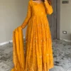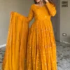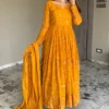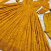 Get ready to look outstanding with our Partywear Anarkali Gown for girls in Mustard yellow shade with sequin embroidery.
