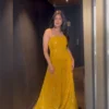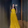 Make a statement with the mikado yellow women’s jumpsuit. This bright and sunny one piece is perfect for making an entrance, no matter where you go. Constructed from light-weighted yellow fabric, this sleeveless attire has got intricate thread work on its body. Style with sandals or heels – either way, you’ll definitely step up your style game when wearing this eye-catching number.