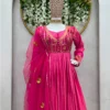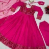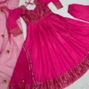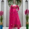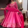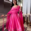 Grab a lot of compliments by donning this subtle yet elegant traditional pink Anarkali suit. This plain pink suit is gracefully embroidered in the neck yoke and comes with heavy borders. Perfect for any festive or casual wear, this Anarkali suit doesn’t let you compromise your comfort.