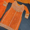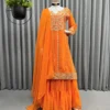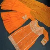 Featuring elegant yellow coloured Sharara suit on its neckline, sleeves and borders. It comes with a yellow coloured sharara and faux georgette dupatta.